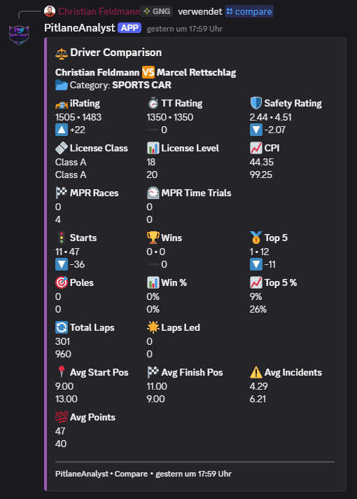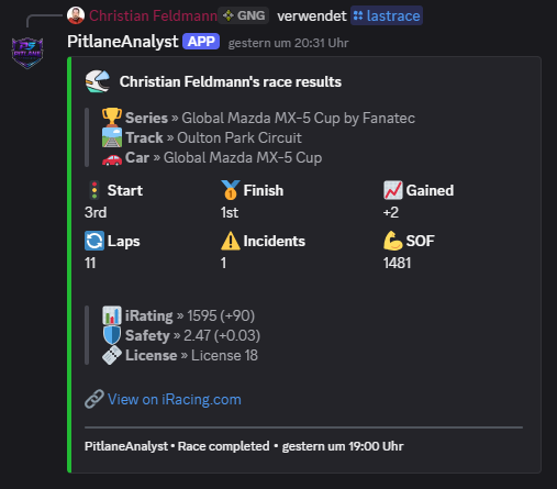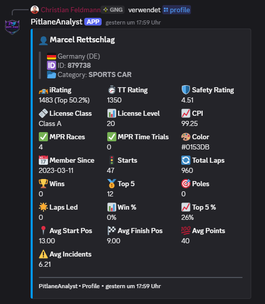 Der Bot hat diverse Fähigkeiten euch und eure Freunde mit Informationen rund um iRacing zu versorgen.