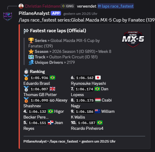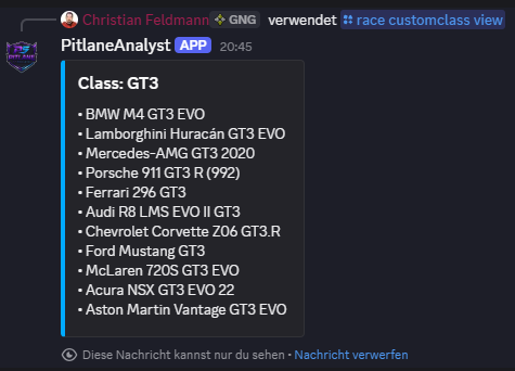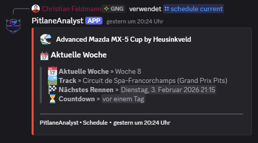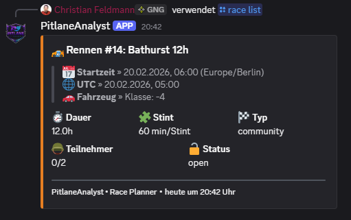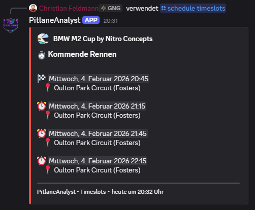 Wollt ihr wissen wann die nächsten Rennen einer Serie stattfinden nehmt ihr /schedule timeslots