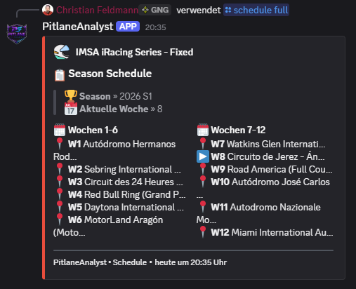 Der Befehl /schedule full zeigt euch die Strecken einer Serie für eine gesamte Season.